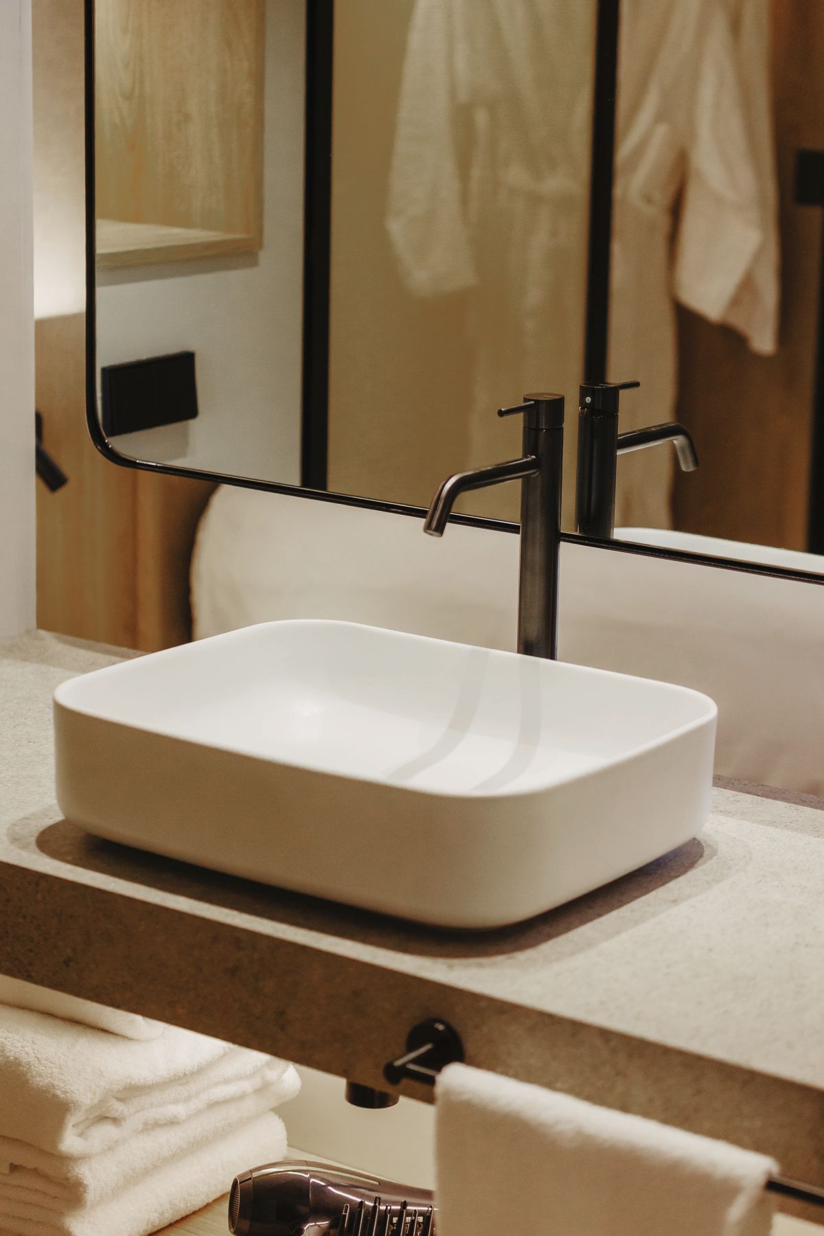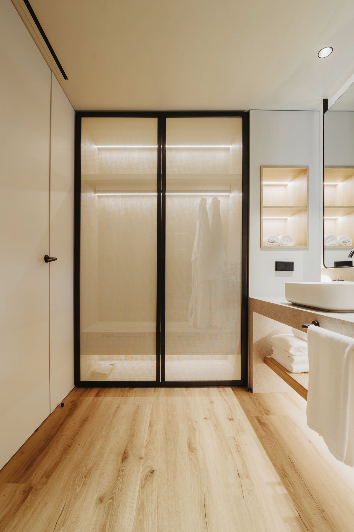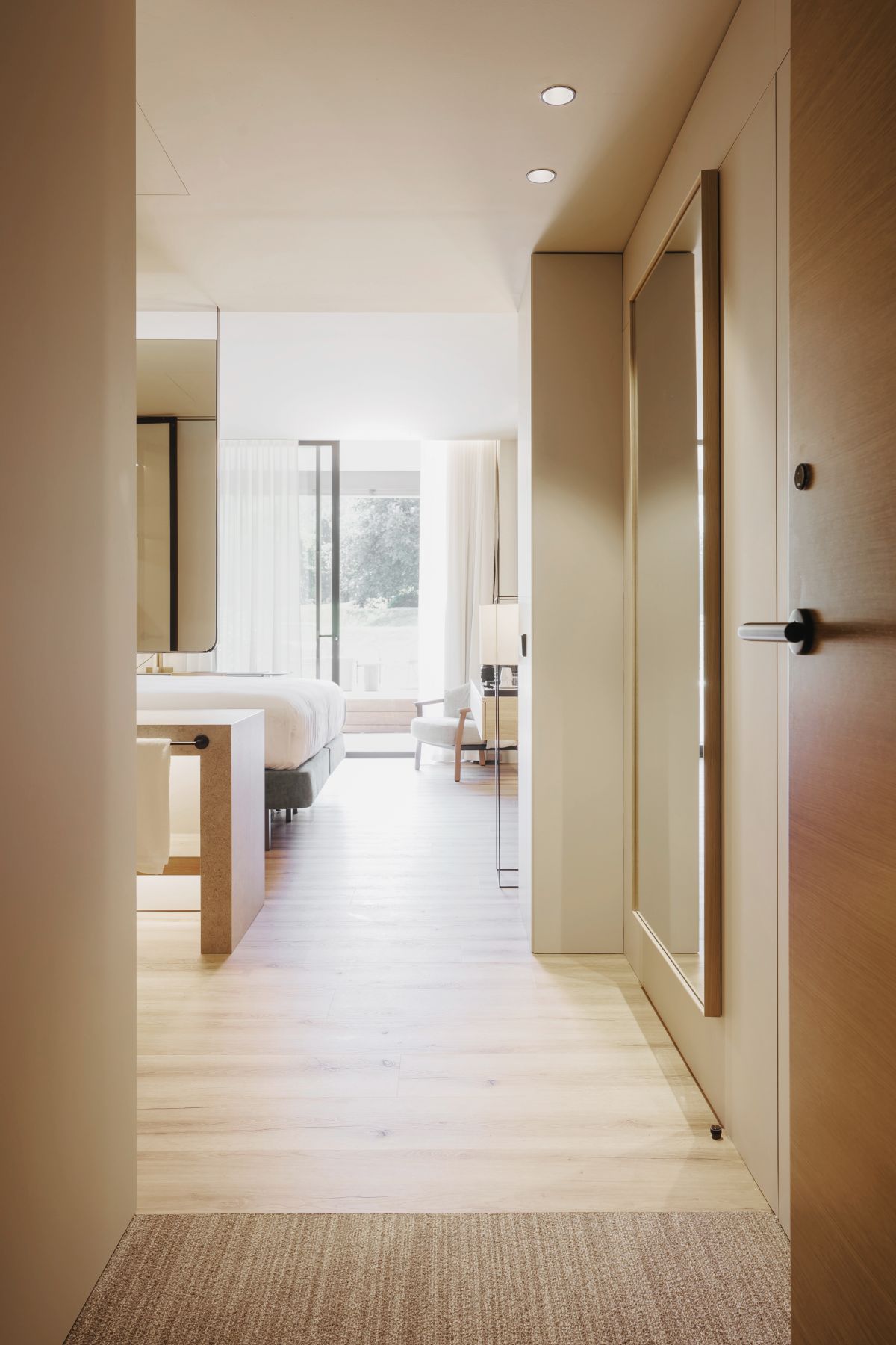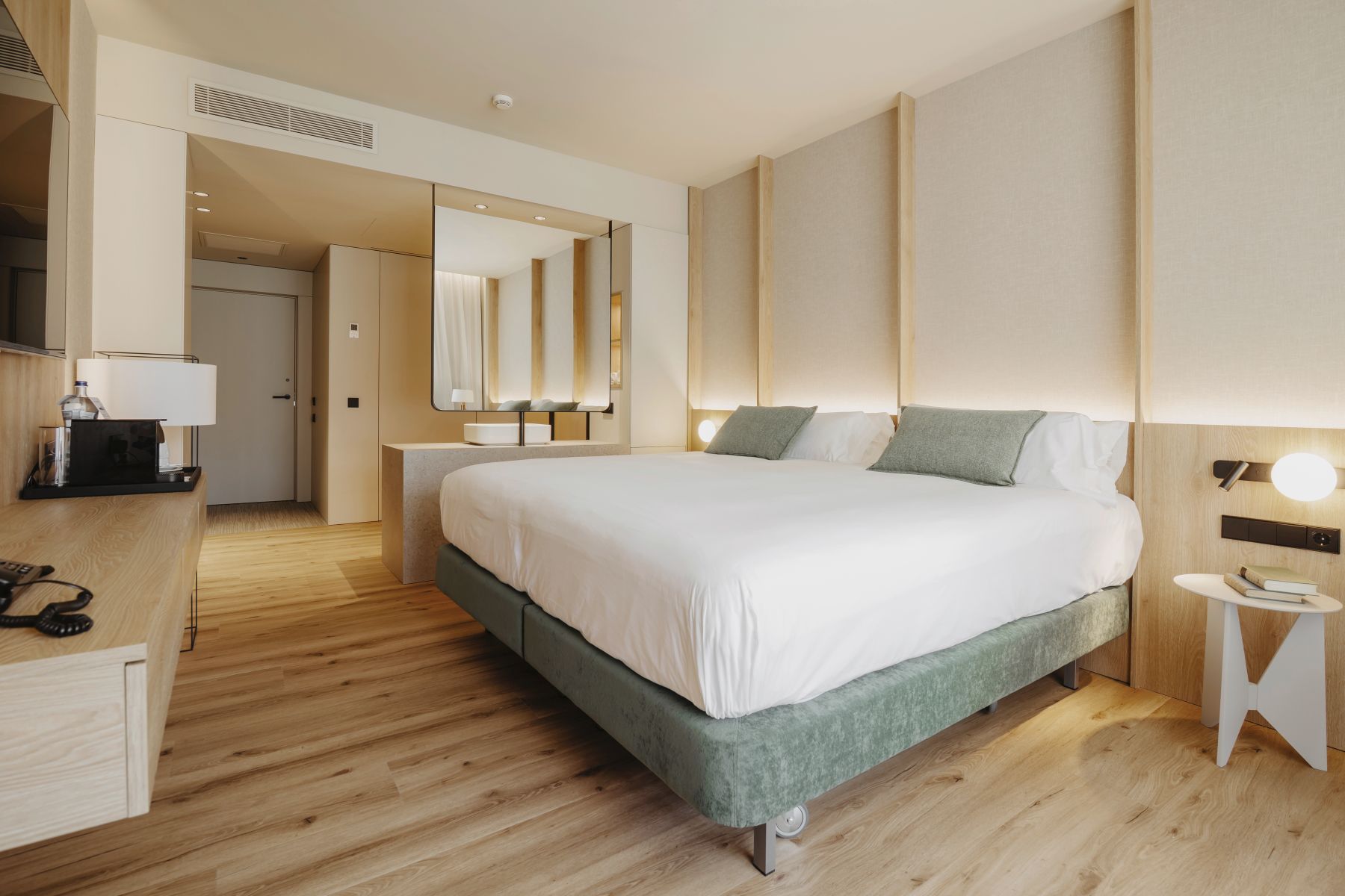 Hemos seleccionado materiales atemporales y duraderos que se adaptan a la línea estética del resto del hotel. El espacio se ha redistribuido abriendo la zona de aseo e integrándolo en el espacio del dormitorio.