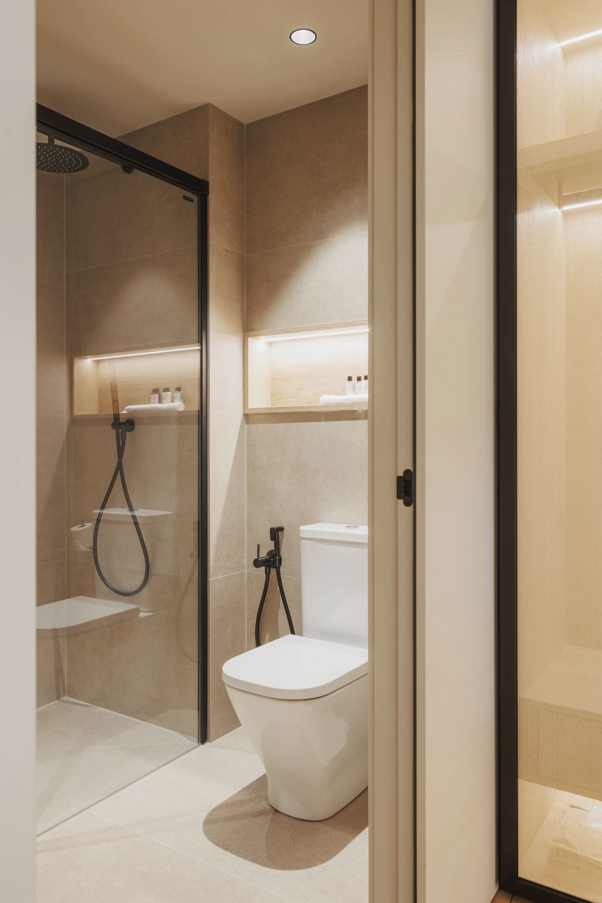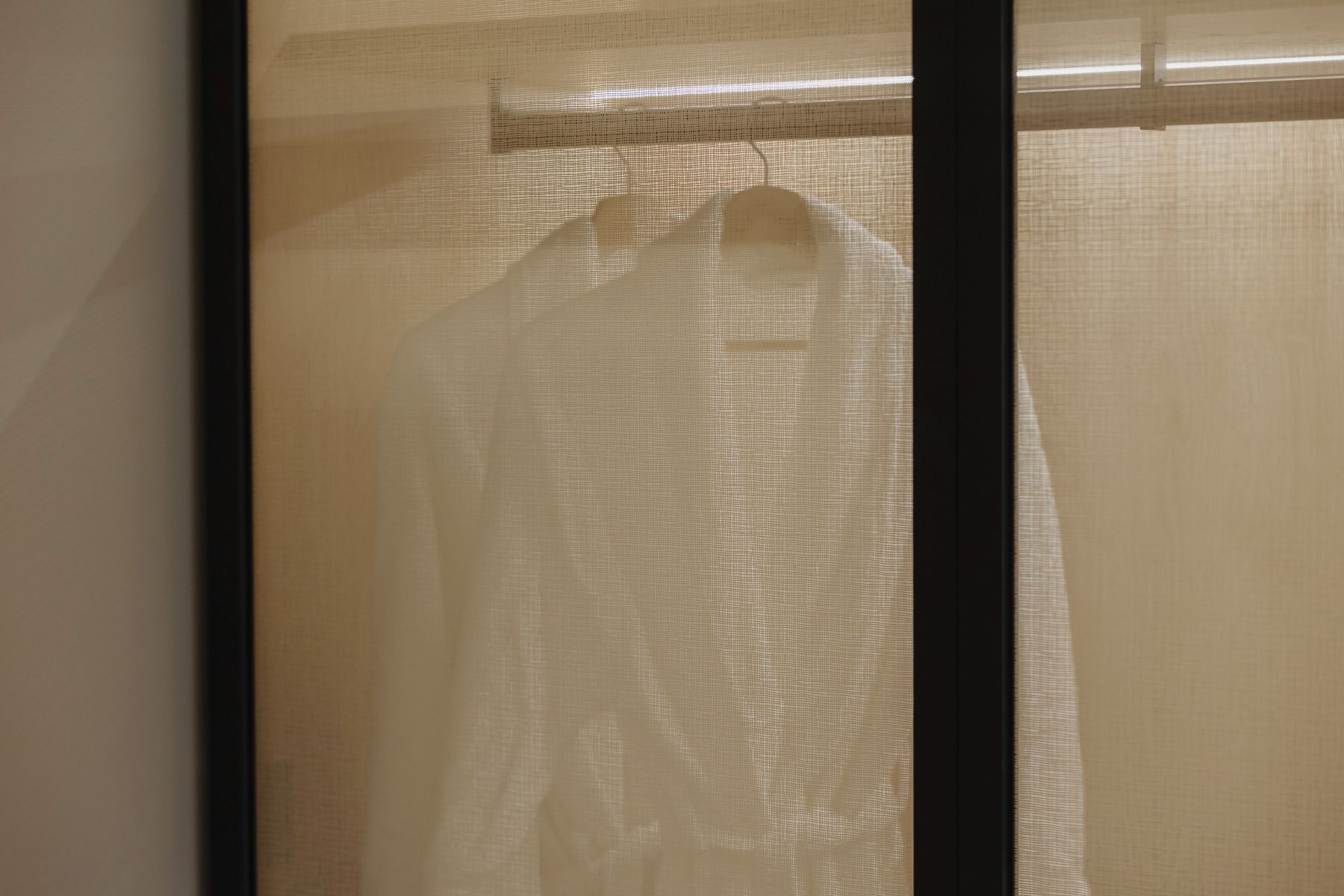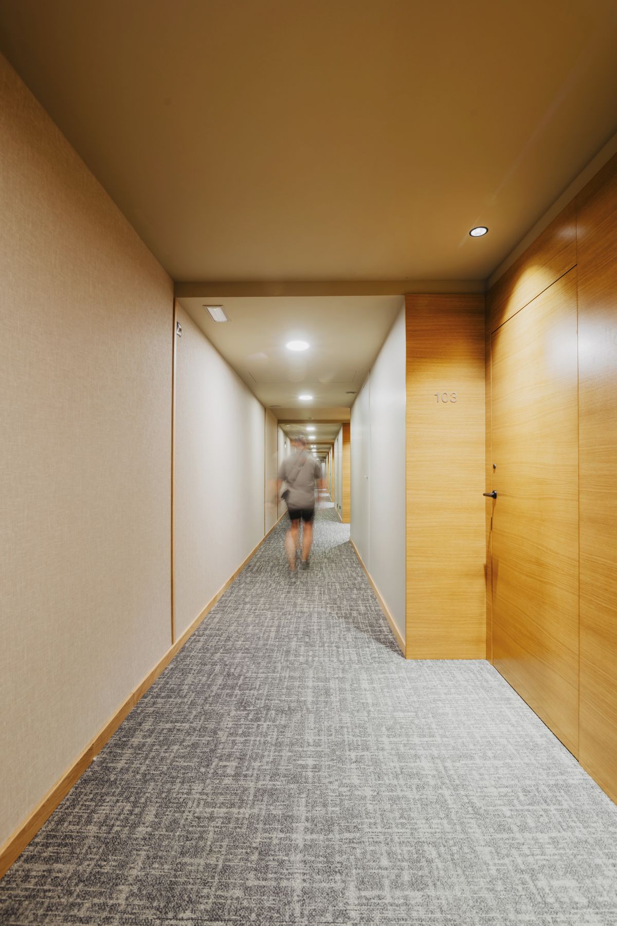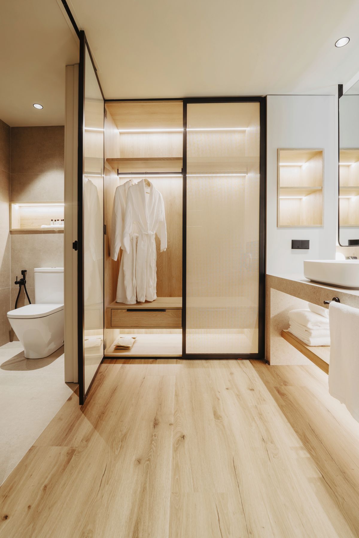 Hemos seleccionado materiales atemporales y duraderos que se adaptan a la línea estética del resto del hotel. El espacio se ha redistribuido abriendo la zona de aseo e integrándolo en el espacio del dormitorio.
