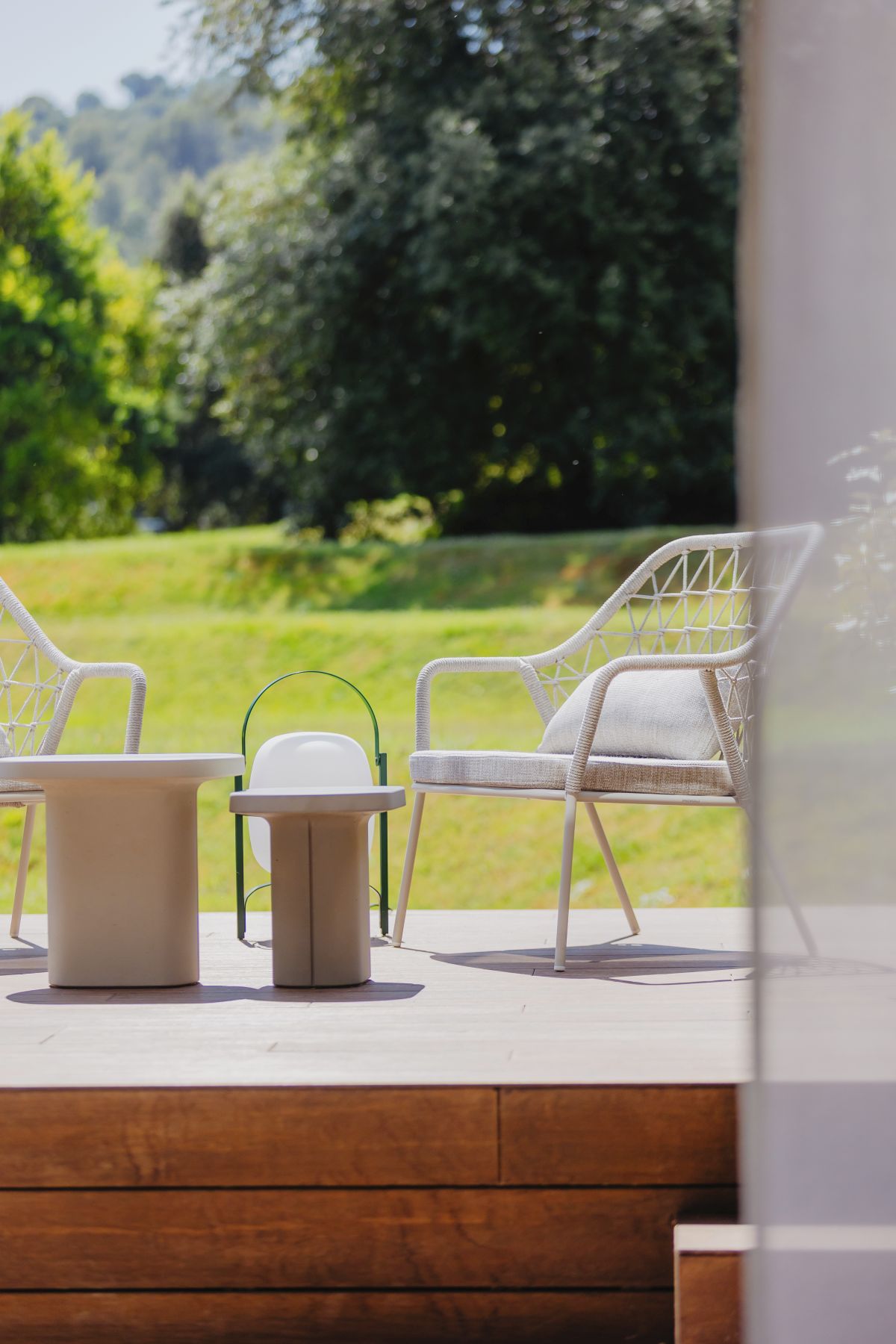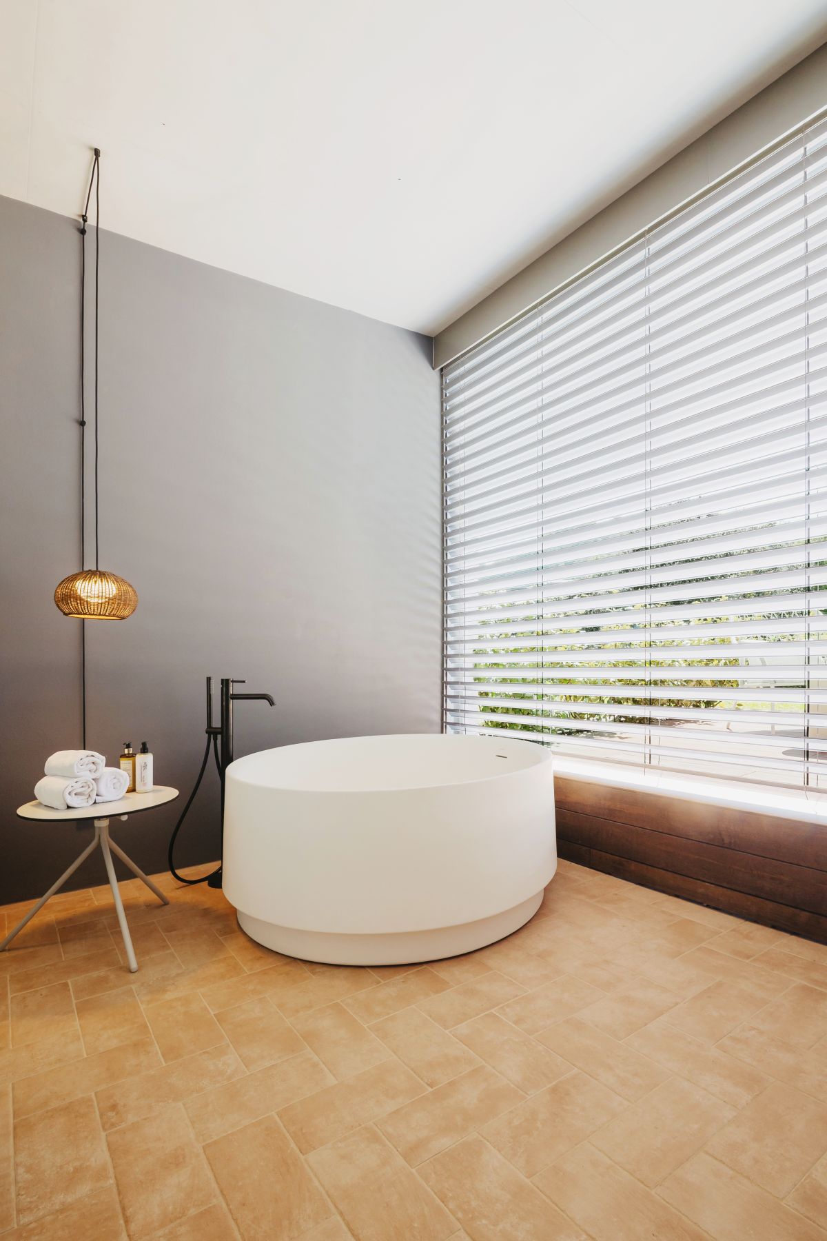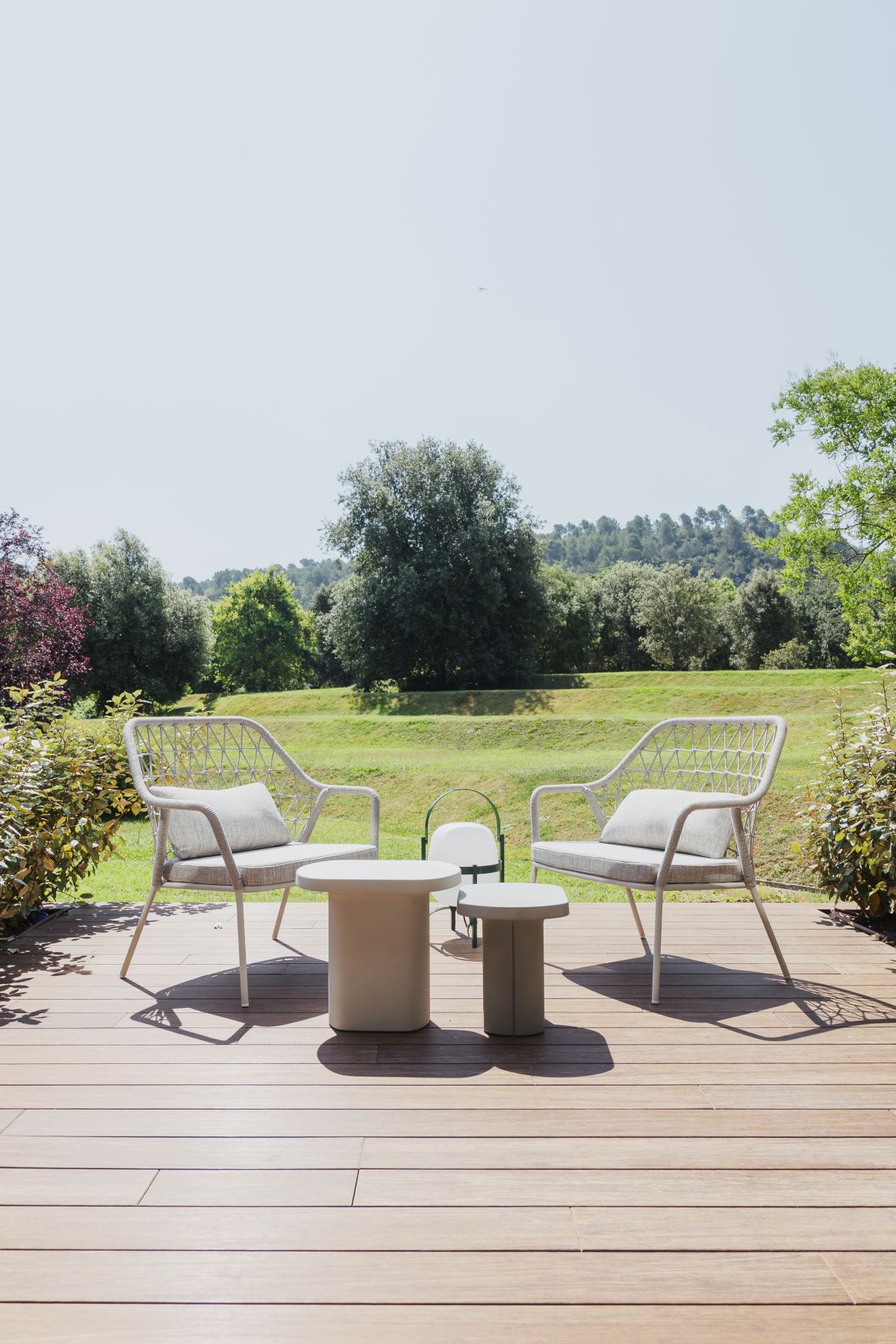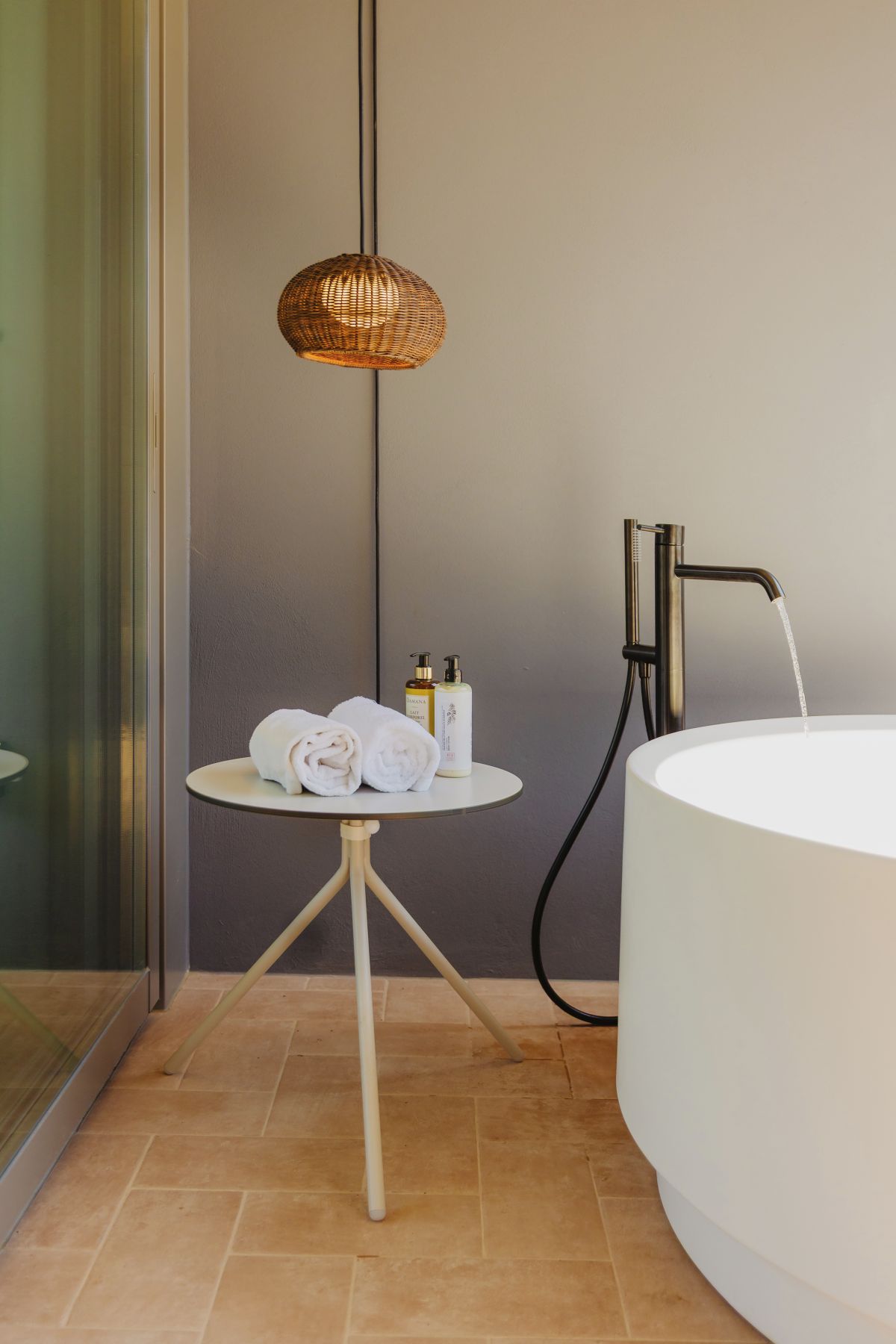 En estos tres dormitorios hemos querido potenciar la conexión del espacio interior con el exterior con una amplia terraza privada que se introduce en el jardín mediterráneo del hotel y que contiene una bañera exterior.